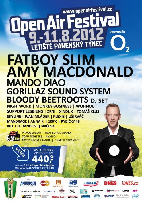 Open Air Festival (9. – 11.8. 2012) přichází opět s pestrou hudební paletou, díky které vaše kroky v srpnu nemohou vést nikam jinam, než na letiště v Panenském Týnci. Za elektronickou scénu poprvé na českém festivalu vystoupí legenda taneční hudby Fatboy Slim. Kytarové sekci bude vévodit písničkářka Amy Macdonald. Oba interprety doplní dříve ohlášení Mando Diao a Gorillaz Sound System. Hudbu všech žánrů obstarají přední kapely české a slovenské scény. Kromě hudebních zážitků, které rozezní více jak 9 hudebních pódií, festival nabídne sportovní a adrenalinové aktivity, divadlo, workshopy i atrakce pro děti.